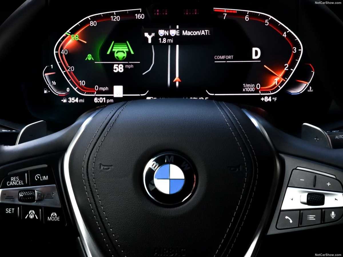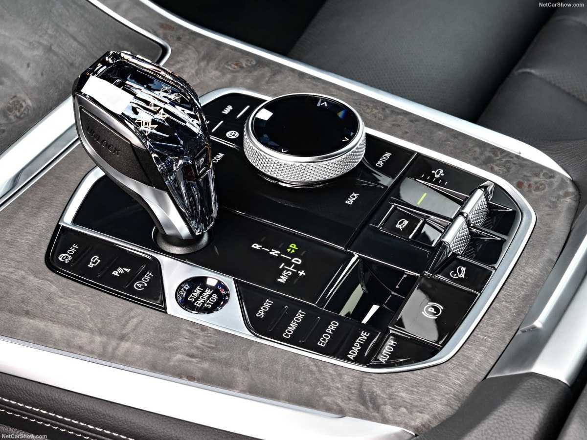 Центральная консоль наверху оснащается 10,2-дюймовым дисплеем мультимедийно-развлекательного комплекса iDrive. Управляется комплект шайбой на панели торпедо. Ниже классический блок климат-контроля с монитором, шайбами и хромированными кнопками раздельного климат-контроля.