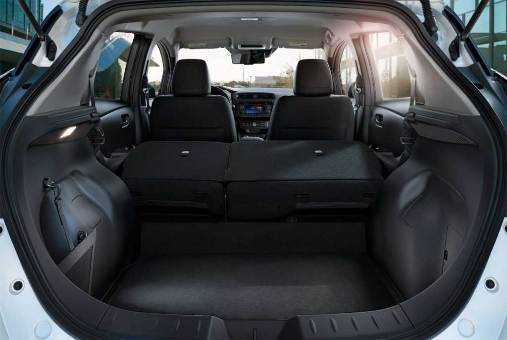 Багажное отделение Leaf 2017 полностью отвечает запросам С-класса – 435 литров полезного пространства. Стоить заметить, что этот объем может быть меньше из-за монтирования двойного пола с органайзером или усилителя акустики Bose. На втором ряду кресел можно сложить спинки 2-мя неровными секциями, что существенно наращивает вместительность «трюма», но тогда появляется большая «ступенька» в салон.