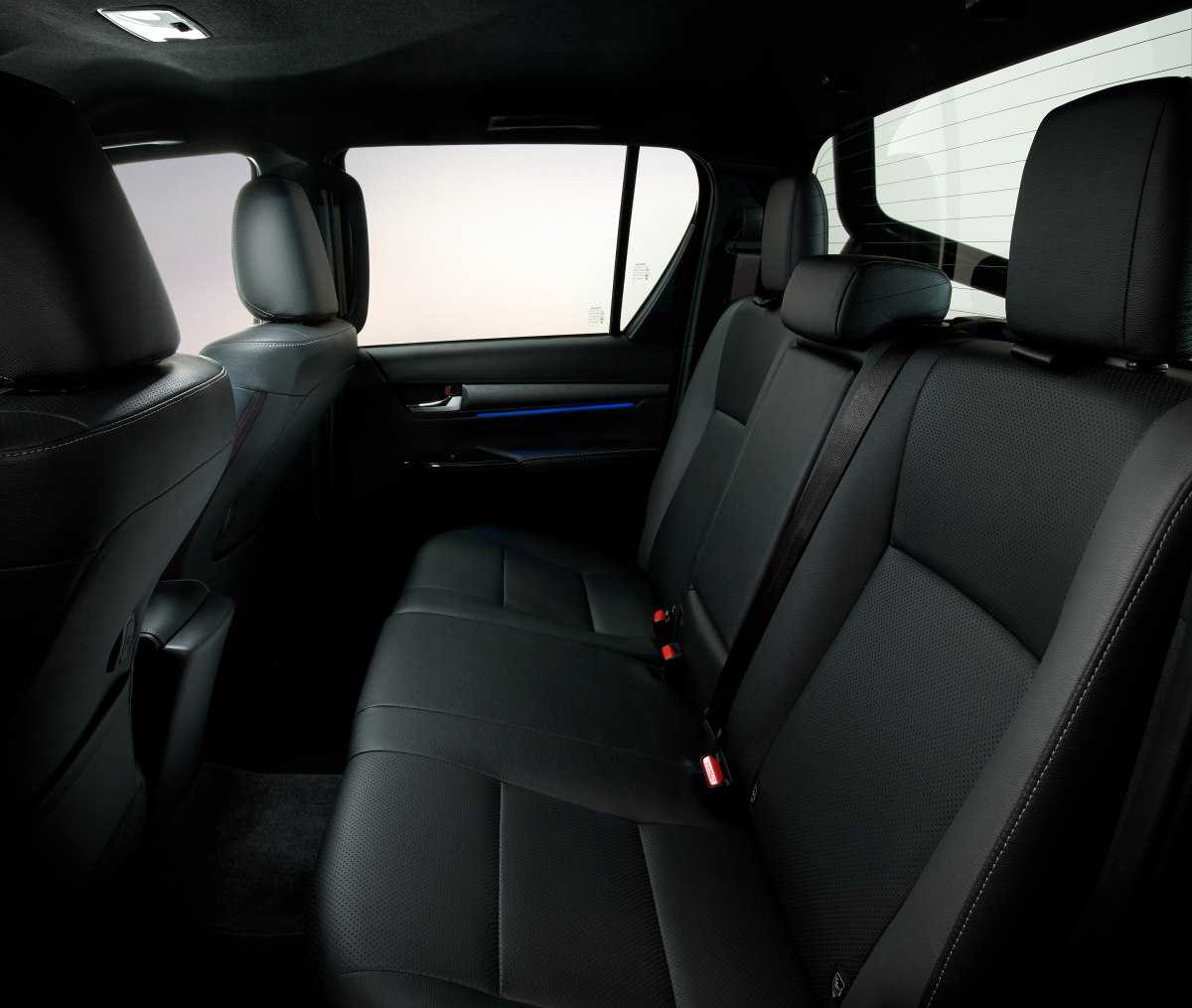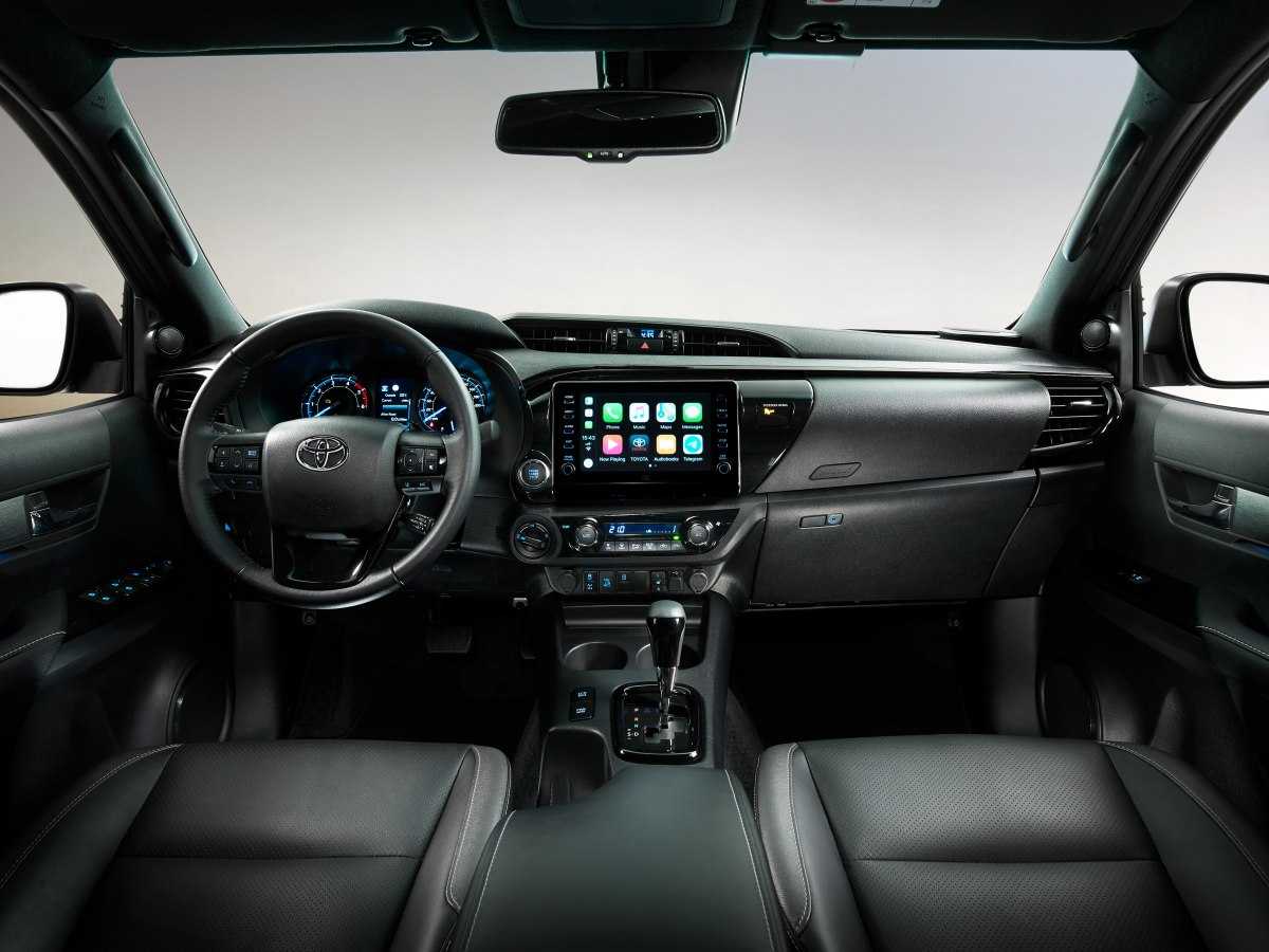 Японский пикап Тойота Хайлюкс — это более интересный в плане оформления салона автомобиль. Здесь также предусмотрена в основном темная обивка внутреннего убранства. В центре размещен большой экран мультимедийной системы, а также блок климата