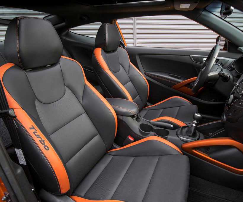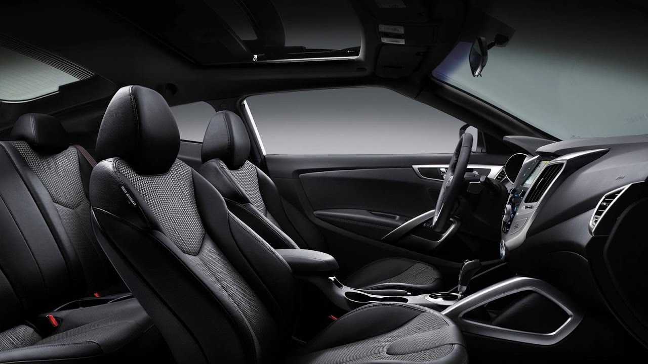 Внутреннее убранство Хендай Велостер радует глаз, всё отделано качественными материалами: передняя панель выполнена из мягкого и приятного пластика, а материал сидений — комбинация ткани и искусственной кожи. Передние кресла Велостера имеют ярко выраженную боковую поддержку. Сами сиденья первого ряда удобны и имеют достаточно широкие диапазоны регулировок. Задний диван рассчитан на двух пассажиров и имеет хороший запас пространства в ногах и по ширине, однако из-за формы крыши головы высоких пассажиров будут упираться в потолок. Кроме того, узкий дверной проем затрудняет доступ на второй ряд.
