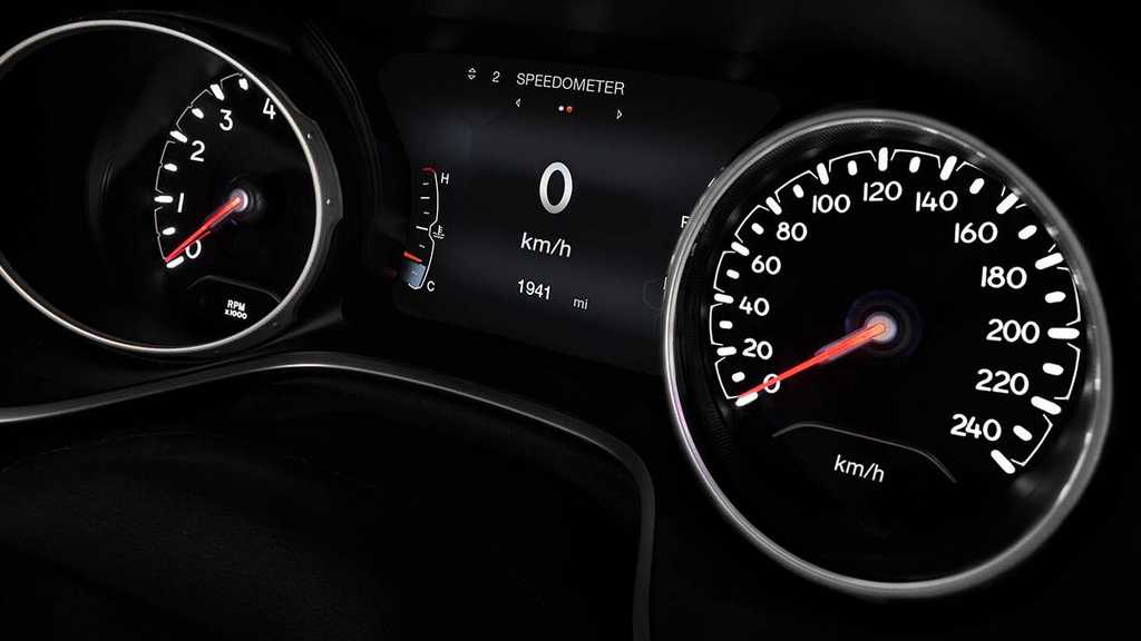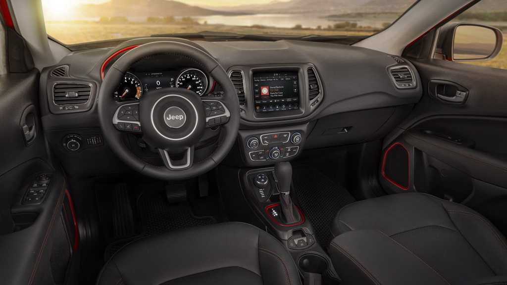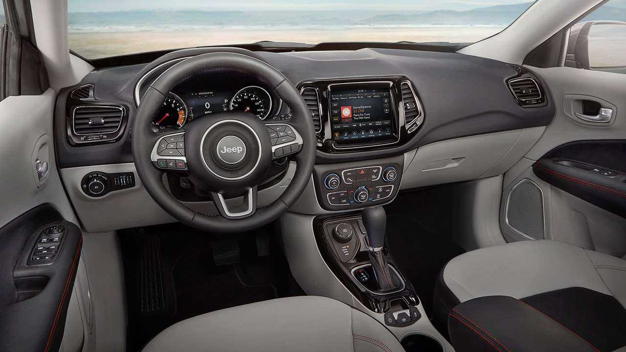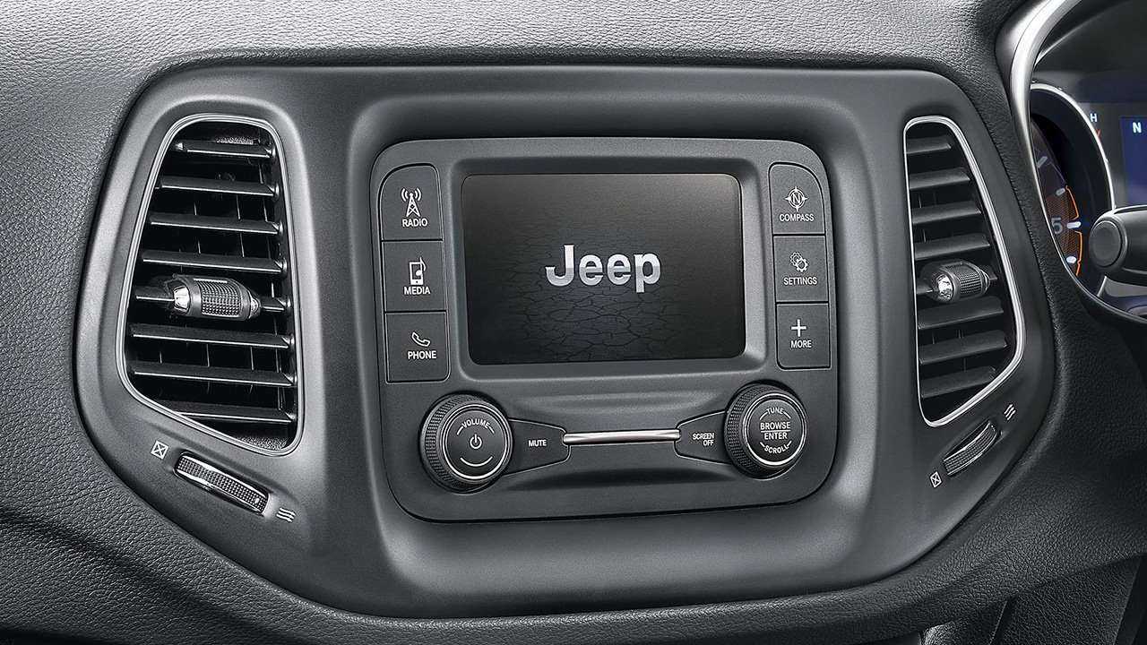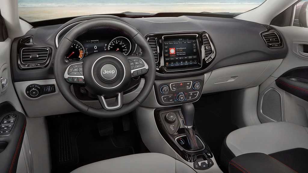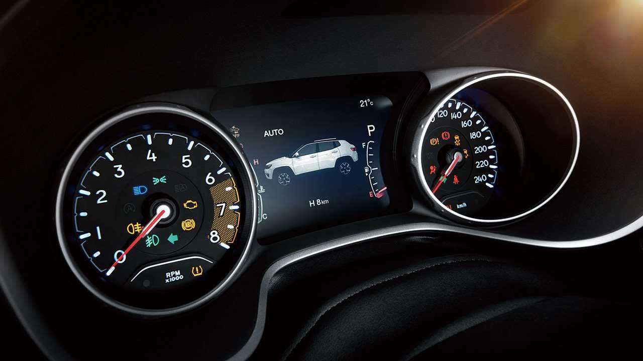 Приборный щиток оснащается сенсорным экраном. С его помощью водитель получит необходимую информацию о скорости, температуре масла или иных параметрах автомобиля. Также сюда могут выводиться карты системы навигации, если она установлена в Джип Компас 2019.