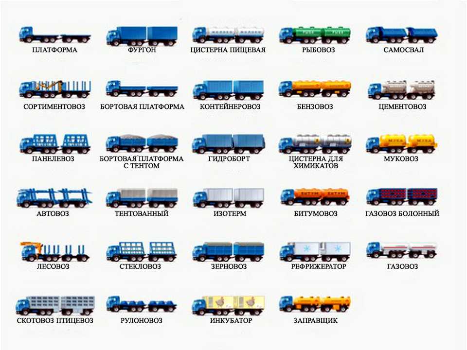 Все известные виды грузовиков обозначаются общим термином «грузовая техника». Грузы, которые перевозит такая техника, могут быть самые разнообразные: жидкости, коробки, другие автомобили, строительная доска и необработанный пиломатериал. В качестве карго могут выступать и люди. В зависимости от разновидности перевозимого груза на грузовик устанавливается соответствующий тип кузова: цистерна, поворотный кран, седельно-сцепное устройство, фургон. Так формируется различная спецтехника. Самый распространенный тип – грузовик бортовой – плоская грузовая платформа с откидными бортами. Неприхотливые советские бортовые грузовики – ГАЗы и ЗИСы – были главными помощниками Красной Армии в годы Великой Отечественной войны.