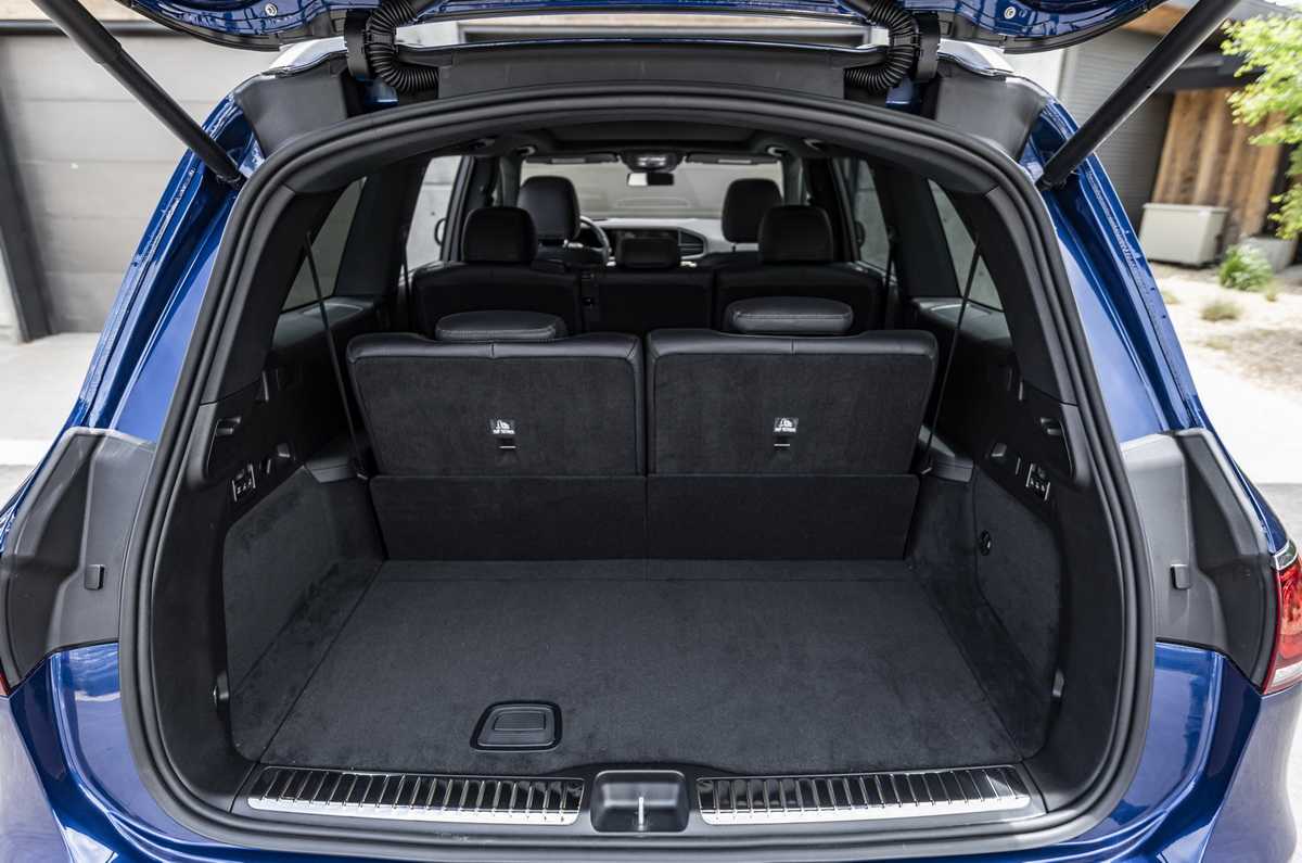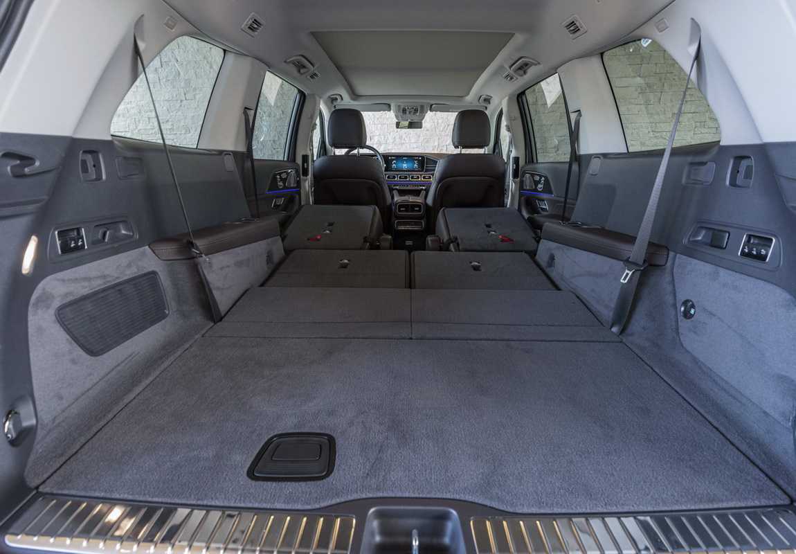 Очевидно, что внедорожник таких размеров получил огромный багажник. По факту объем 680 литров и это очень хороший результат. Но, модели для 7 человек будут иметь только 300 литров, так как сиденья «сжирают» пространство. Для крупногабаритных грузов существует функция складывания двух задних рядов сидений по итогу получая 2300 литров объема. Огорчает, что несмотря на габариты и потенциальную возможность установить в Mercedes-Benz GLS 2019 полноценную запаску, под полом все равно установлена докатка.