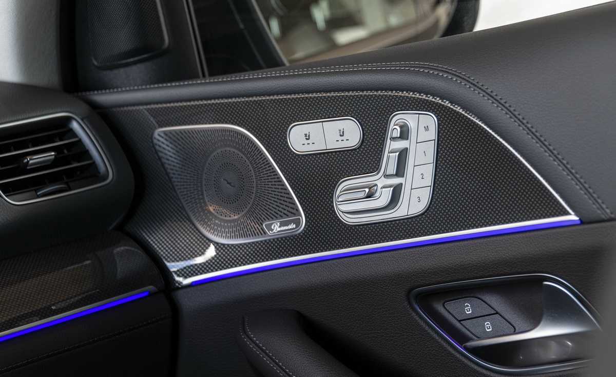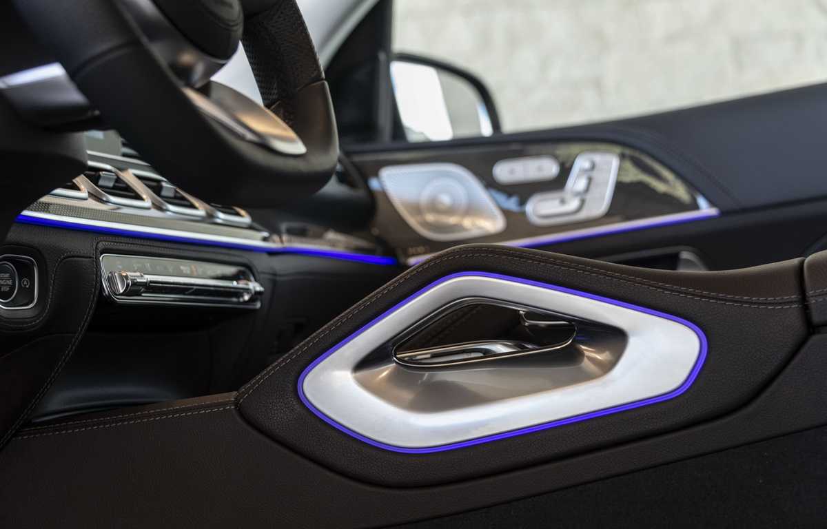 Внедорожник оснащается двумя 12.3-дюймовыми сенсорными экранами, которые размещены на центральной консоли и визуально воспринимаются как один элемент, поскольку их стыковка осуществлена абсолютно бесшовно. С их помощью осуществляется управление информационно-развлекательной системой Mercedes MBUX с беспроводной зарядкой и Hi-End стереосистемой объемного звука Burmester.