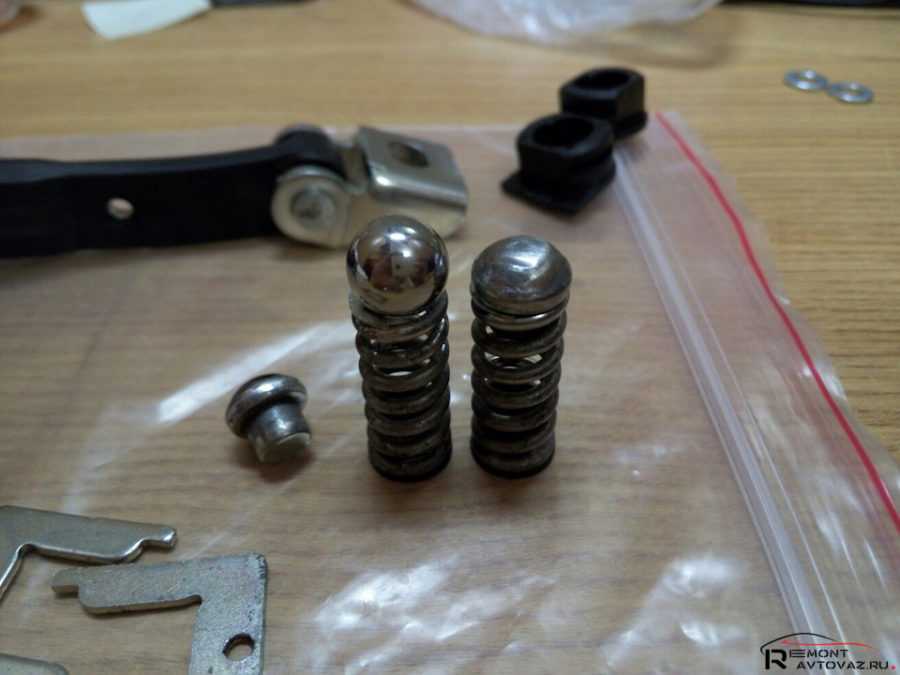 Когда компоненты будут извлечены, их нужно разобрать и заменить металлические полусферы на шарики. Для этого первым делом вынимается металлическая пластина – она подковыривается отверткой и гвоздем, и вынимается. Можно работать плоскогубцами. При этом стоит прижимать сбоку сам ограничитель, чтобы пружина не выстрелила. Когда пластина извлечена, остается снять сбоку ограничителя Весты пластиковую крышку и вынуть пружину, на краю которой закреплена металлическая полусфера.