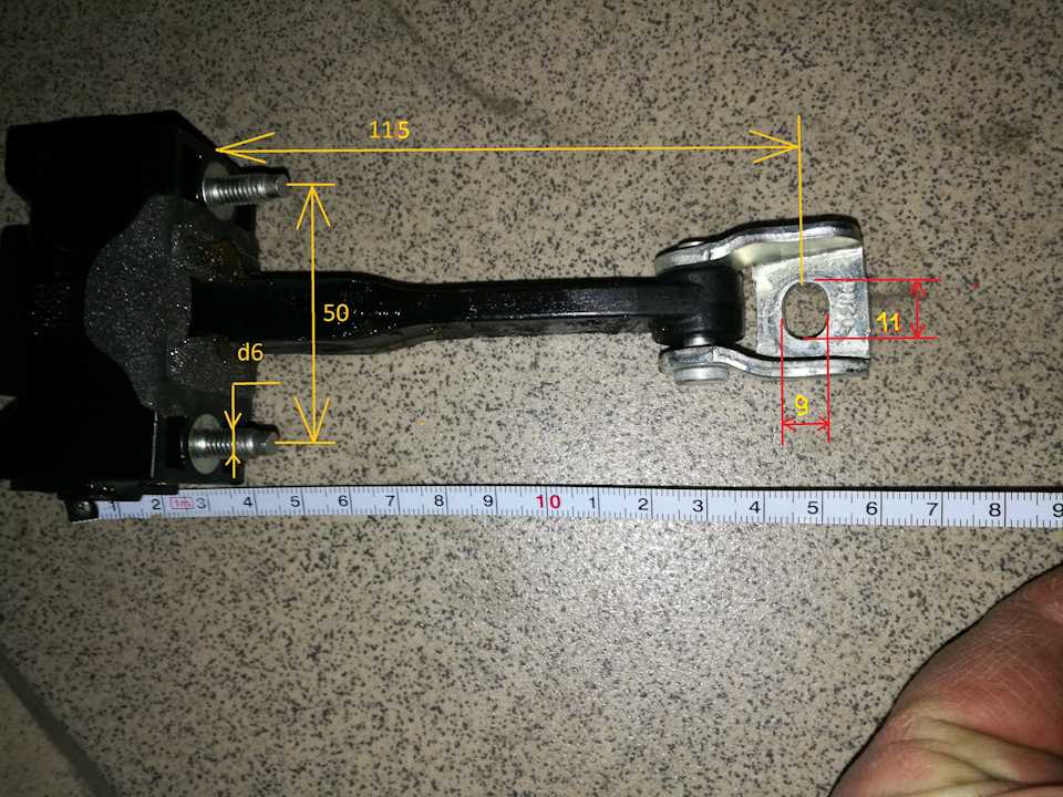 - Длина самого ограничителя в полностью открытом состоянии – от корпуса компонента до центра крепежного отверстия, через которое ограничитель болтом Torx Т40 фиксируется к кузову. Для Лада Веста это 115 мм, тогда как для Фокуса 3 – 116-117 мм.