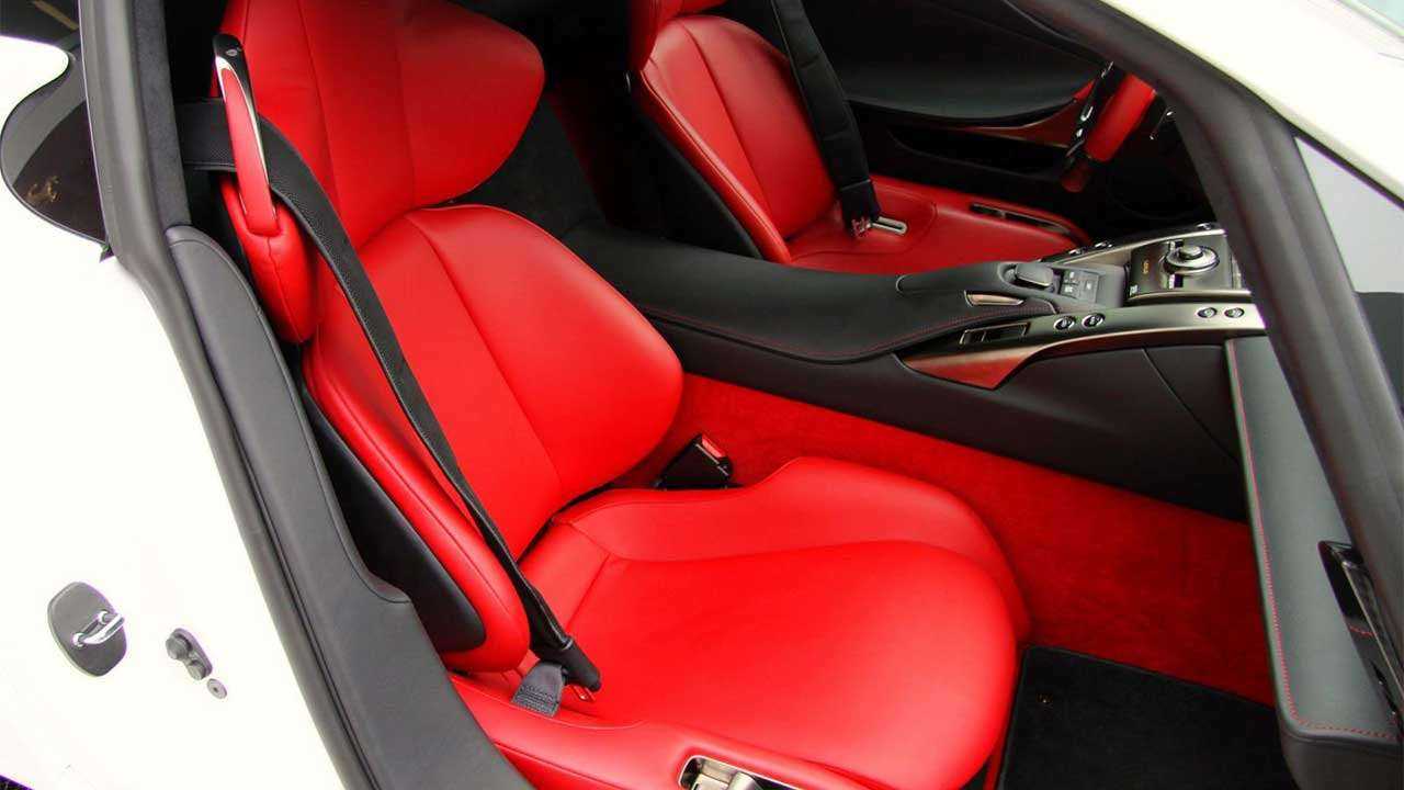 Для водителя и пассажира были установлены спортивные кресла, которые обшиты красной кожей. Сиденья обеспечат хорошее удержание при резких поворотах. Кстати интересно открывается дверь, в верхней части присутствует кнопка, это сделано для аэродинамики.