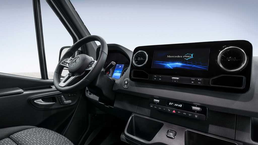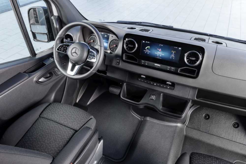 Качество и стиль отделки фургона находятся на высочайшем уровне. Так, новый Мерседес Спринтер 2019 модельного года получил отличные материалы отделки – ткань, пластик, вставки из металлов и искусственную кожу, настолько хорошо состыкованные друг с другом, что не возникает никаких посторонних трений и скрипов даже после длительной эксплуатации. Порадует владельцев и система мультимедиа, которая перешла сюда с автомобилей выше классом.