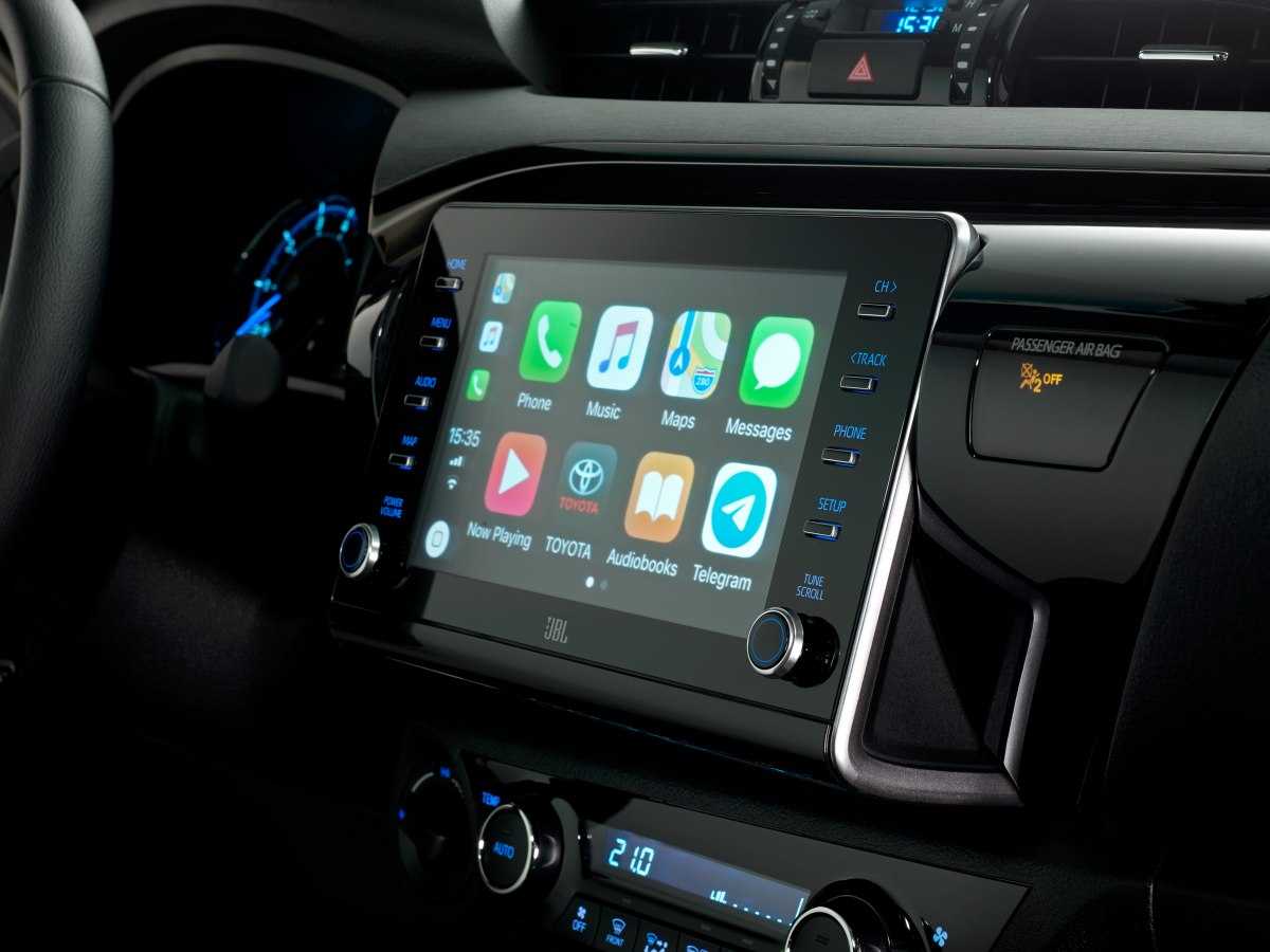 Японский пикап Toyota Hilux выполнен в традиционном стиле для торговой марки. Этот автомобиль имеет декоративную подсветку по периметру, которая сильно подчеркивает темный цвет обивки. При первой посадке в салон автомобиля складывается ощущение, что находишься за рулем не внедорожного пикапа, а в модели, близкой к премиальному сегменту. Здесь предусмотрена практичность в расположении главных элементов управления. Автомобиль имеет необычное цифровое табло на верхней части передней панели. Больше всего выделяется центральная консоль с огромным экраном системы мультимедиа и стильным блоком управления климатом. Кроме того, приятные эмоции вызывает приборная панель, где разместились привычные шкалы с умеренной подсветкой.
