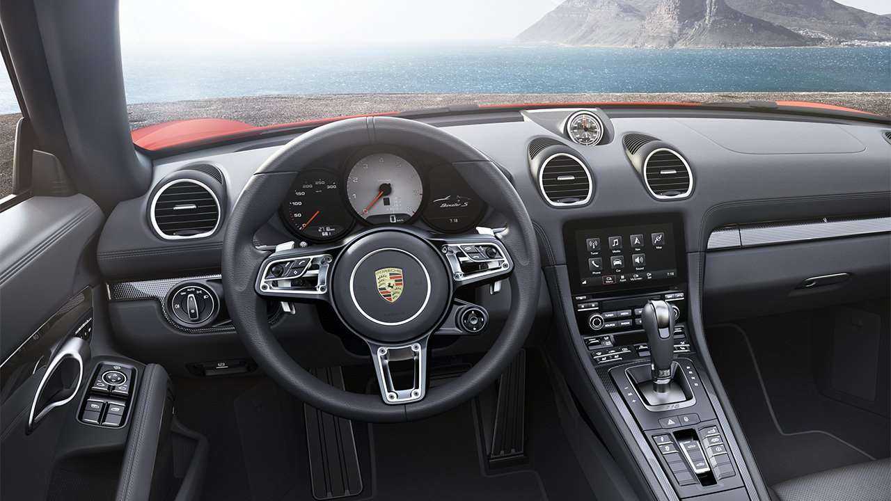Центральная часть торпеды Porsche 718 Boxster выглядит немного скучнее. В самом ее центре расположились традиционные аналоговые часы, по бокам от которых можно видеть дефлекторы воздуховодов. Еще ниже начинается мультимедийный блок, представленный 7-дюймовым дисплеем и отделенным блоком управления аудиосистемой.