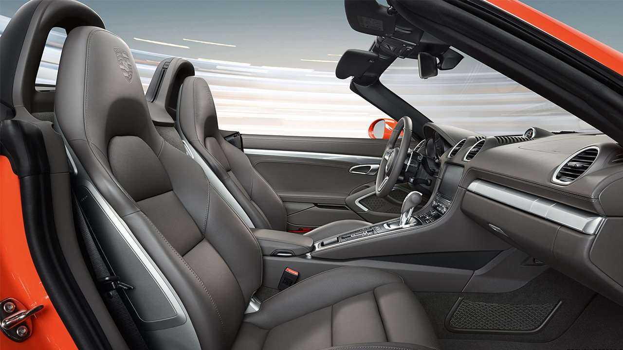 В целом двухместный салон родстера весьма просторен и удобно разместиться в нем могут даже рослые пассажиры. Найдется место и для багажа. В кабриолете Porsche 718 Boxster аж два багажных отделения. Первый находится спереди, а его объем составляет 150 литров, второй с объемом 125 литров нашел себе место в задней части автомобиля. Места под запасное колесо, к сожалению, не нашлось.