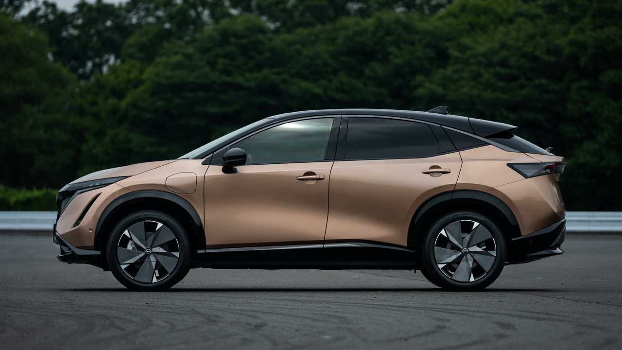 В профиль кроссовер смотрится максимально динамично и элегантно. Спортивный характер модели подчеркивают агрессивная линия крыши, надутые боковины, короткие свесы кузова и крупные колеса. Стандартно автомобиль комплектуется 19-дюймовыми дисками с шинами 235/55 R19, а в качестве опции доступны 20-дюймовые диски с резиной 255/45 R20. Контрастная черная крыша является обязательным атрибутом японского электрокара.