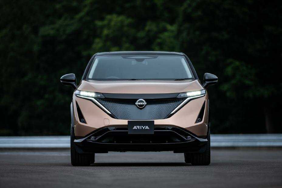 Облик новой батарейной модели Ariya, по заявлениям разработчиков, выполнен в стилистике «японский футуризм». Данная концепция подразумевает сочетание простых форм и атлетичных поверхностей. При этом спереди сохраняется фирменный дизайн V-motion, правда, в новой интерпретации. Классической решетки радиатора электро-кроссовер лишен, а вместо нее установлена гладкая декоративная панель, под которой скрывается традиционный японский орнамент kumiko. Имеющая встроенную подсветку панель совмещена с тонкими светодиодными фарами, оснащенными четырьмя мини-прожекторами длиной по 20 мм. В центр помещен обновленный логотип бренда с 20-ю диодами, загорающимися одновременно с основной подсветкой.