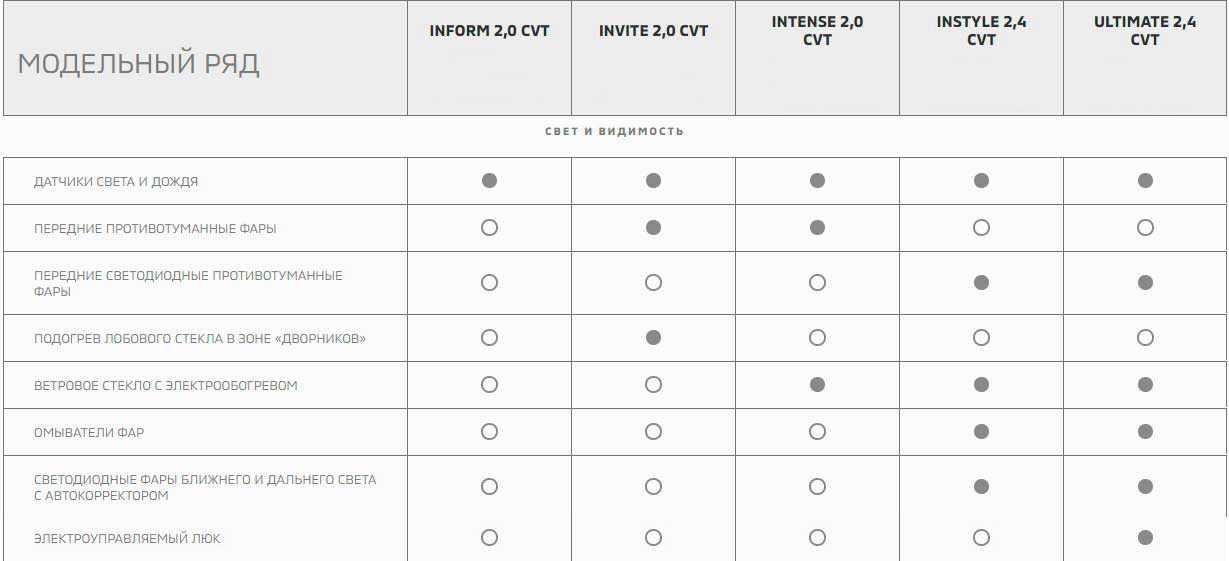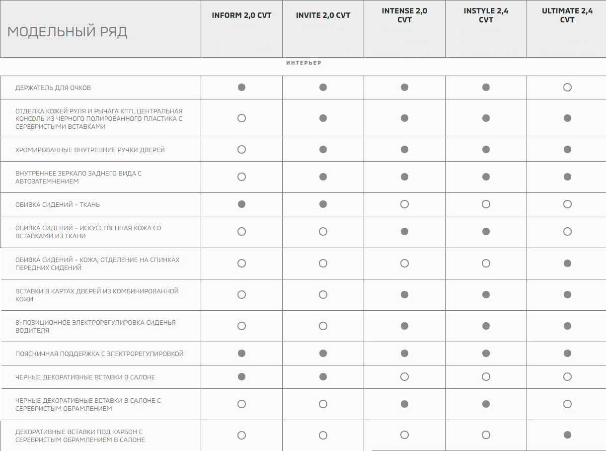 - Inform – базовая начальная версия с минимальным набором опций и дополнительного оборудования. Оснащается климат-контролем, стеклоподъёмниками на электроприводе, передними подушками безопасности, ABS, регулировки передних кресел и руля.