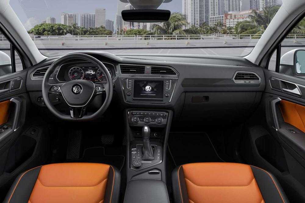 Здесь мы рассмотрим салон «Тигуана» в максимальной комплектации почти со всеми опциями. Первое, что бросается в глаза — это кожаный двухцветный салон. Яркий оранжевый цвет вставок на сидениях и в отделке дверей придает дорогой более солидный вид. Консоли и панели выполнены без вставок, в традиционных серых и черных тонах.