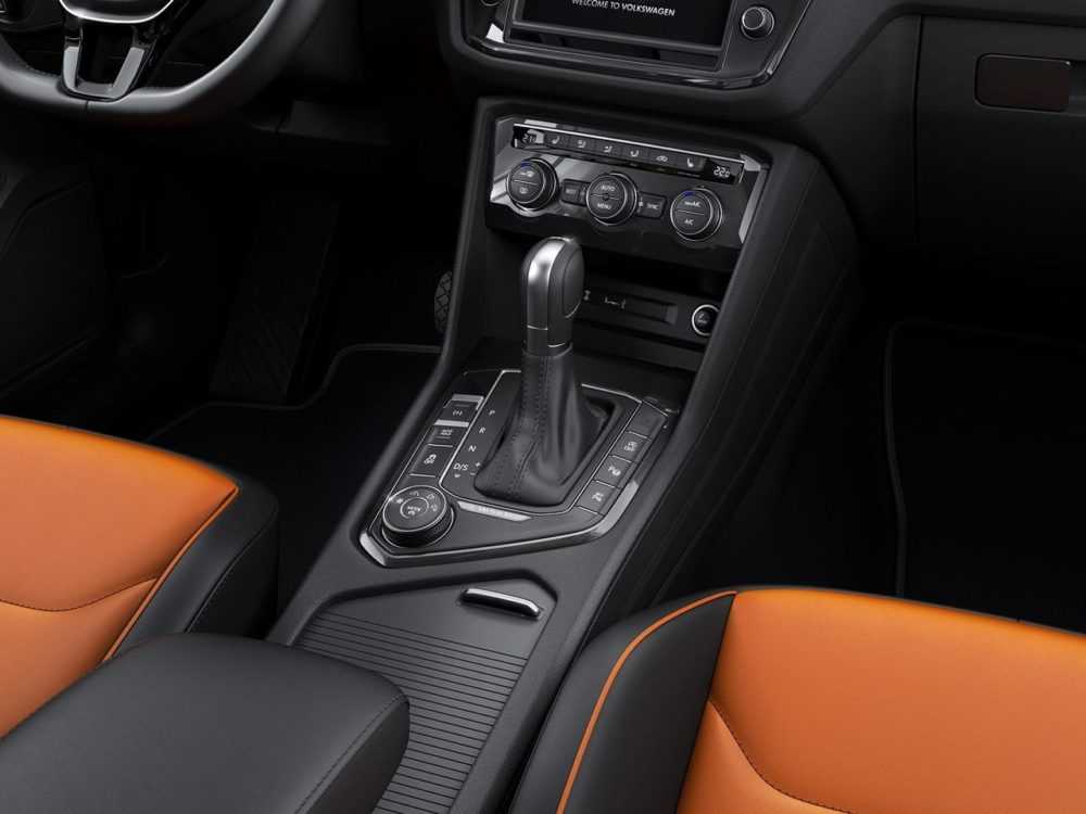 Вокруг рычага коробки передач расположено много разных клавиш, в том числе клавиши запуска двигателя, электрического «ручника», включения ассистента для движения в пробках. Также «Тигуан» поддерживает несколько режимов работы: внедорожный, индивидуальный, зимний, и обычный. Переключаться между ними можно с помощью шайбы, расположенной под ручником. Клавиша Mode в середине шайбы позволит переключаться между экологическим и спортивным режимами.