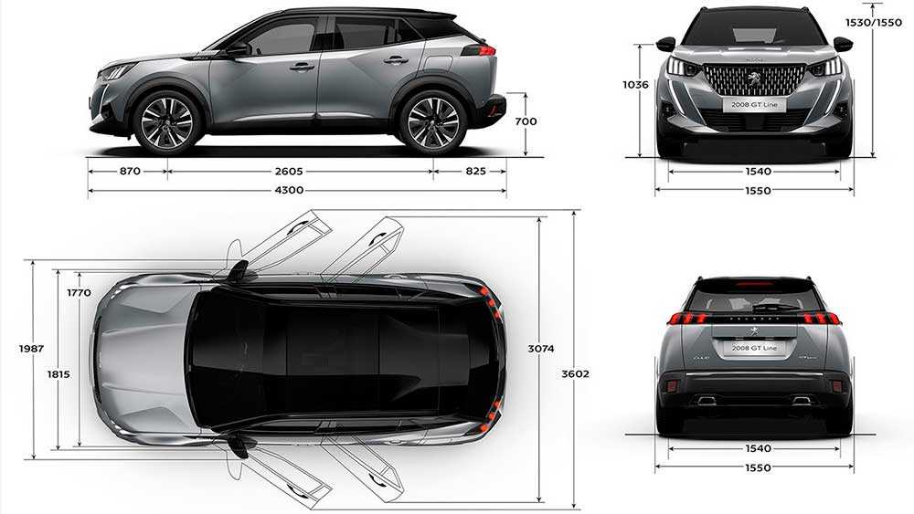Пежо 2008 2020 модельного года – это компактный автомобиль SUV-класса с длиной 4300 миллиметров, с шириной и высотой – 1770 и 1550 мм (с учетом боковых зеркал ширина составляет 1987 миллиметров).