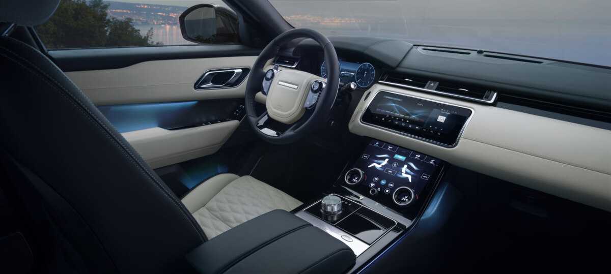 Салон Velar исполнен просто и дорого. Искусственной кожей отделаны сидения, дверные карты, трансмиссионный тоннель и передняя панель. А пластиковые детали имеют лакированную поверхность. Передняя панель у Velar размещается под углом по отношению к днищу. На центральной консоли присутствует сенсорный монитор, снизу которого располагается аналогичный дисплей с двумя крупными шайбами. Еще одна, предназначенная для выбора режимов движения, находится на трансмиссионном тоннеле.