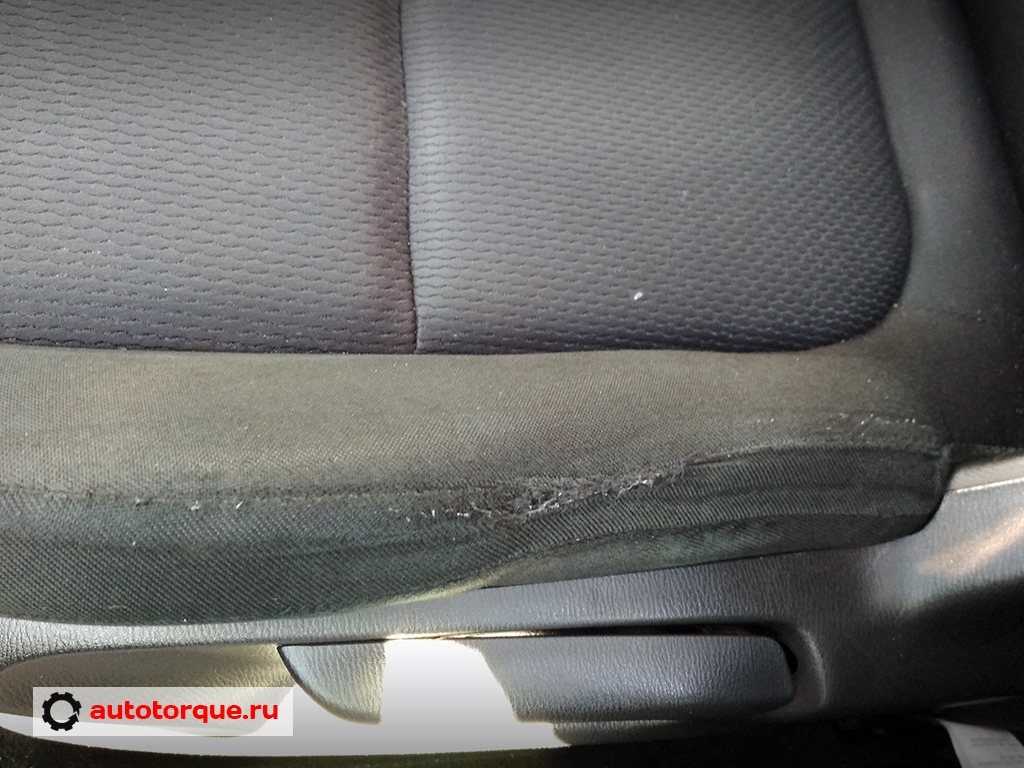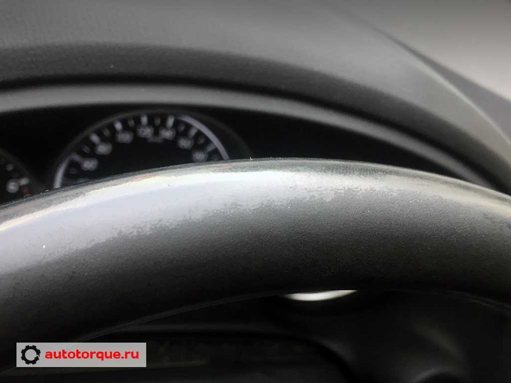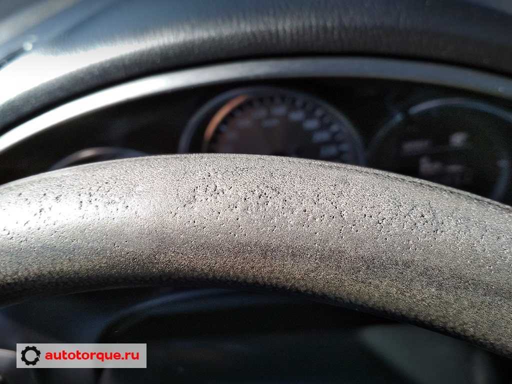 Не самым износостойким прослыло и кожаное рулевое колесо, которое держит свою округлую форму, но при этом теряет эпидермис. К 100 тыс.км баранка будет выглядеть примерно так: