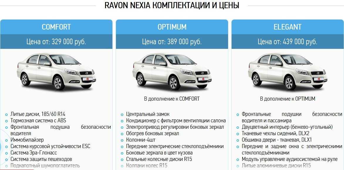 Автомобиль Ravon Nexia R3 представлен в 5 разных комплектациях. Начинается с базовой Comfort МТ, а заканчивается 4 более укомплектованными вариантами, такими как: Optimum МТ и Optimum АТ, Elegant МТ и Elegant АТ.
