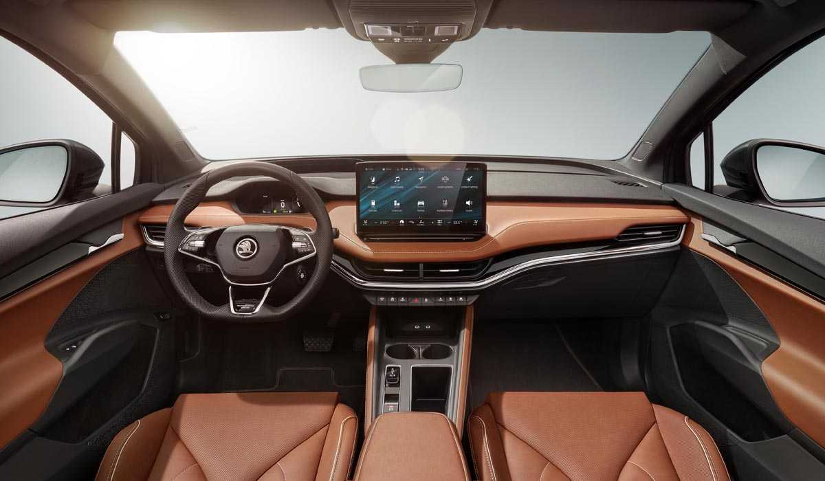 В кузовном дизайне нового кроссовера просматриваются компоновочные детали ранее показанного фирменного концепт-кара Skoda Vision iV и новой версии электромобиля Volkswagen ID.4. В ракурсе анфас новая модель чешского электрокара уверенно демонстрирует: