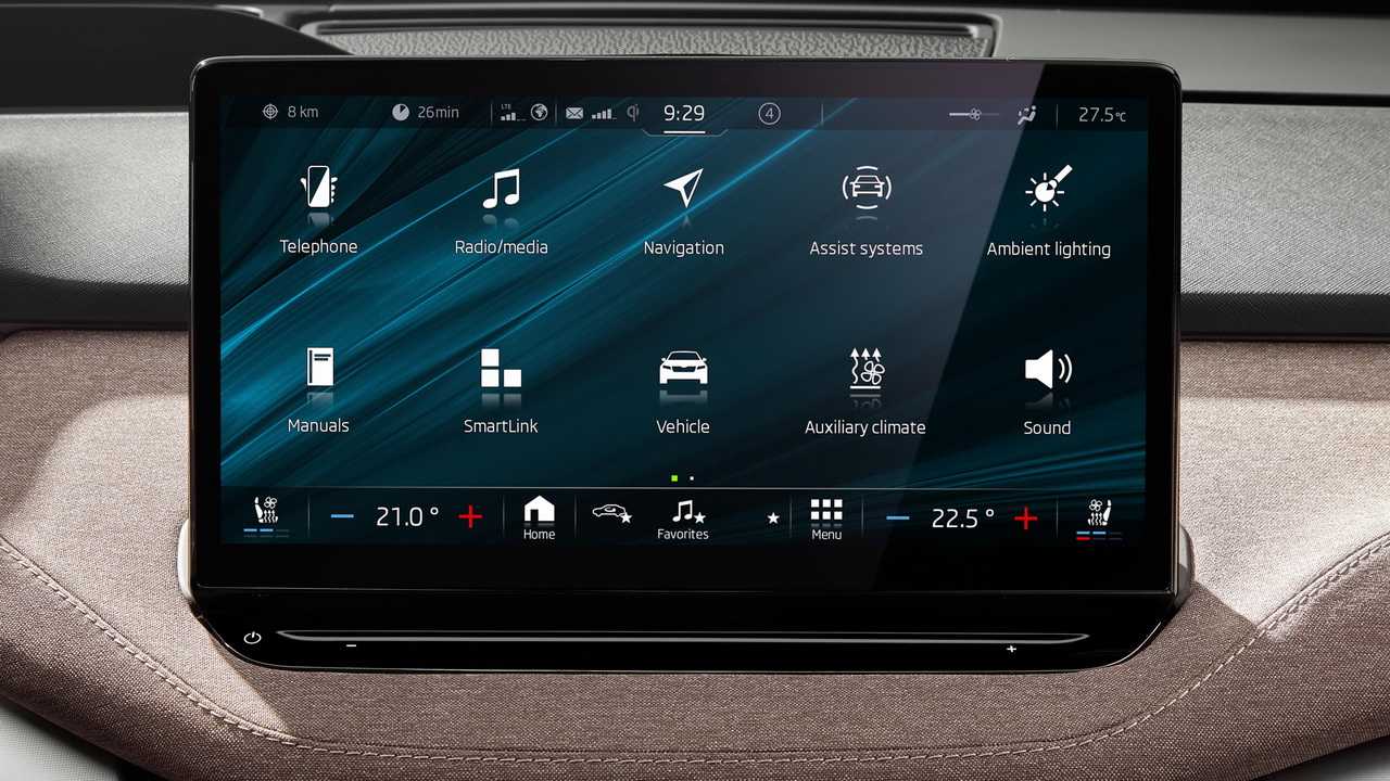 Кроме того, на центральной консоли установлена 13-дюймовая информационно-развлекательная система с сенсорным экраном, который является самым большим из предлагаемых на Skoda. Система поддерживает беспроводную технологию SmartLink, Android Auto, Apple CarPlay и MirrorLink.