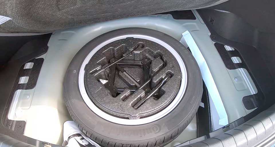 Как и у многих современных авто, у Kia K5 под фальшпанелью имеется углубление для полноразмерной запаски, сверху которой размещается автомобильный инструмент.