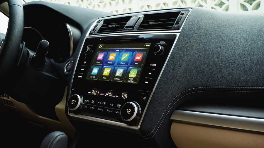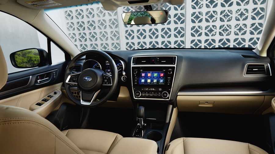 Внутри Субару Легаси 2018 года, новая модель которой уже больше года доступна отечественным покупателям, отличается улучшенным качеством отделочных материалов (включая кожу на креслах даже в базовой комплектации) и новой электроникой. Среди заметных с первого взгляда обновлений стоит выделить: