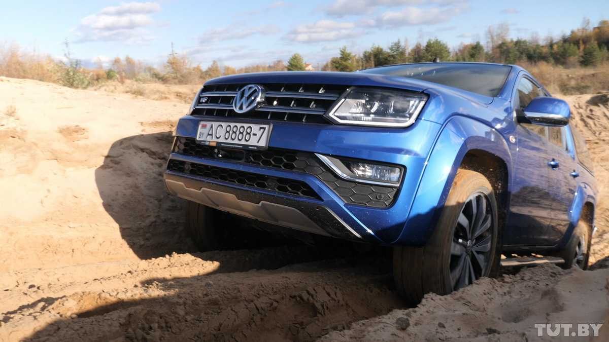 Все так, но не забывайте, что это пикап с неразрезным задним мостом и мощным, но тяжелым мотором на передних колесах. В итоге если пытаться ехать в повороте с тем темпом, что задает мотор, то вы неприятно удивитесь нестабильности поведения: тяжелый нос пытается проехать мимо, прыгающий разгруженный зад пытается сильно довернуть… Не сказать, чтобы Volkswagen Amarok V6 TDI плохо управляется – нет, даже наоборот: он поворачивает и ведет себя в вираже намного лучше практически всех соперников-конкурентов, в нем больше легковых повадок, он дольше сохраняет стабильность при скоростной езде по трассе. Но мотор настолько мощный, что попросту не осознаешь, насколько быстро достигаешь (и превышаешь) скорость 120-130 км/ч, где пикап остается гарантированно стабильным и контролируемым.