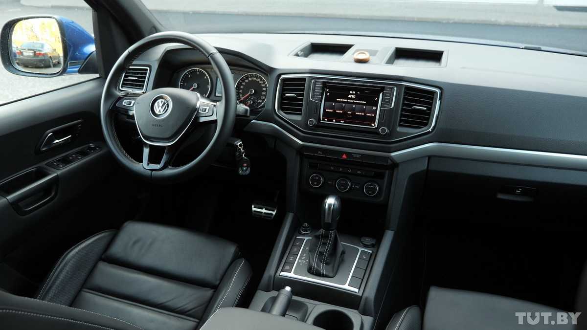 Но больше всего на легковой автомобиль пикап Volkswagen Amarok похож своим салоном. Новая форма передней панели, более строгие прямоугольные дефлекторы вентиляции, новый руль (как на самых современных моделях Volkswagen). Для водителя – и вовсе благо: красивые приборы с цветным дисплеем бортового компьютера, кресло ergoComfort (два передних сиденья) с развитой боковой поддержкой и выдвижным валиком поддержки ног. Да и в целом – хорошая удобная посадка «ноги-руки-руль-спина», масса отсеков и полочек для мелких вещей. Но сзади все не так хорошо, причем не спасает даже отличная кожа: вся беда – в слишком вертикальной посадке. А ведь современные соперники порой предлагают больший наклон спинки и более «легковую» посадку. Хотя по ширине салона, запасу места для коленей или над головой замечаний нет – места много. Багажник? Нет, здесь просто кузов.