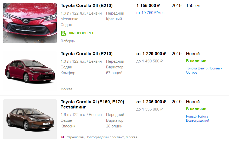 Последнее поколение этой модели популярного японского автомобиля получилось очень стильным и оснащённым по последнему слову технической мысли. Но и его цена по этой причине заметно выросла. В России стоимость такого авто начинается примерно от 1 173 000 рублей. И то, если повезёт, за такие деньги можно купить «Тойоту» лишь в базовой комплектации, которая далеко не отличается шикарным набором функций, и с МКПП. Авто с вариатором обойдётся покупателям примерно на 200 000 рублей дороже. А тем, кто желает приобрести «Короллу» только в максимальной комплектации, придётся раскошелиться на не менее, чем 1 700 000 рублей.