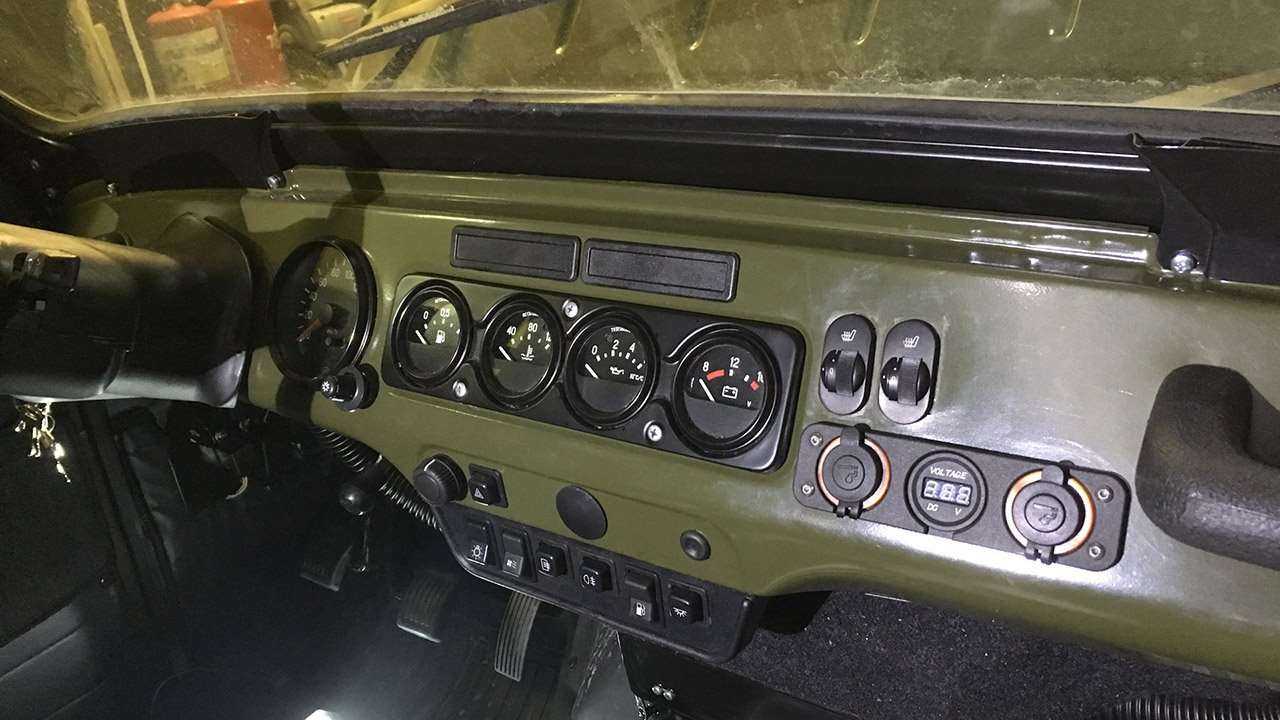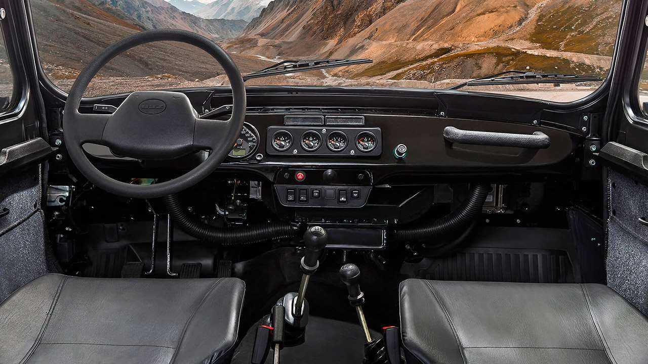 Вместо центральной консоли обустроили проем, в котором проглядывается блок электропроводки и ходы отопительной системы. Стеклоподъемники конструкторы посчитали излишеством, их заменили раздельные стекла. Для проветривания салона одна из половинок просто отодвигается в сторону механическим путем. За контроль трансмиссии отвечает пара рычагов, выходящих из центрального тоннеля. Один элемент служит для управления коробкой передач, второй — раздаточной коробкой.