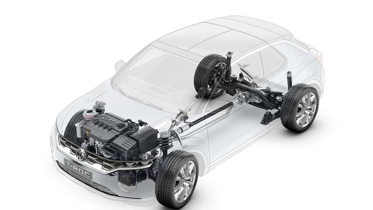 Фактически для Volkswagen T-Roc 2018 новый кузов является плодом глубокого рестайлинга престижного Audi Q2, вышедшего в свет в прошлом году. По информации из последних новостей, обе модели построены на модульной платформе MQB, имеют поперечное расположение силового агрегата и одинаковую колесную базу 2603 мм. Габаритные размеры новинки также схожи: 4234 х 1819 х 1573 мм. Благодаря широкому применению высокопрочных сталей и алюминиевых сплавов в новом кузове, снаряженную массу кроссовера удалось удержать в пределах 1300 кг для базовой версии с передним приводом и механической коробкой передач. Коэффициент аэродинамического сопротивления (Cx=0.31) является одним из самых лучших для данного класса автомобилей. Роботизированные коробки передач будут предлагаться для всех версий модели, тогда как полный привод будет положен только модификациям с моторами мощностью не менее 150 сил.