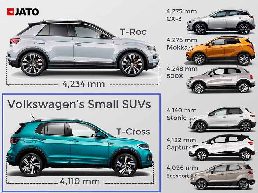 Субкомпактный кроссовер Т-Кросс – автомобиль с длиной 4108 мм, шириной и высотой 1760 и 1584 мм соответственно. Машина имеет колесную базу 2551 мм, прочие характеристики компактного внедорожника: