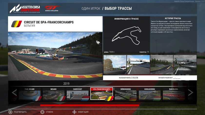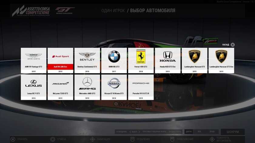 Разительным отличием между Assetto Corsa Competizione и другими играми в этом же жанре является количество контента. Нельзя сказать, что автомобилей или трасс здесь прямо мало, но если в каком-то Need For Speed нам давали под сотню гиперкаров, то здесь выбор гораздо более скудный. И разработчики этого совершенно не стесняются, ведь они решили сделать ставку на качестве каждого автомобиля и каждой трассы, а не на их количестве. И, забегая наперёд, это было правильным решением, ведь обилие в данной ситуации сделало бы гонку слишком уж тяжёлой в освоении. Но об этом мы поговорим в следующем пункте.