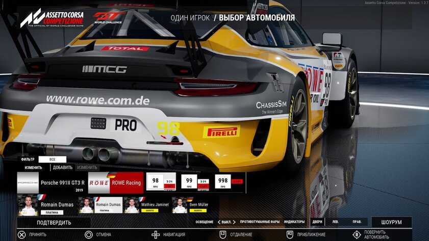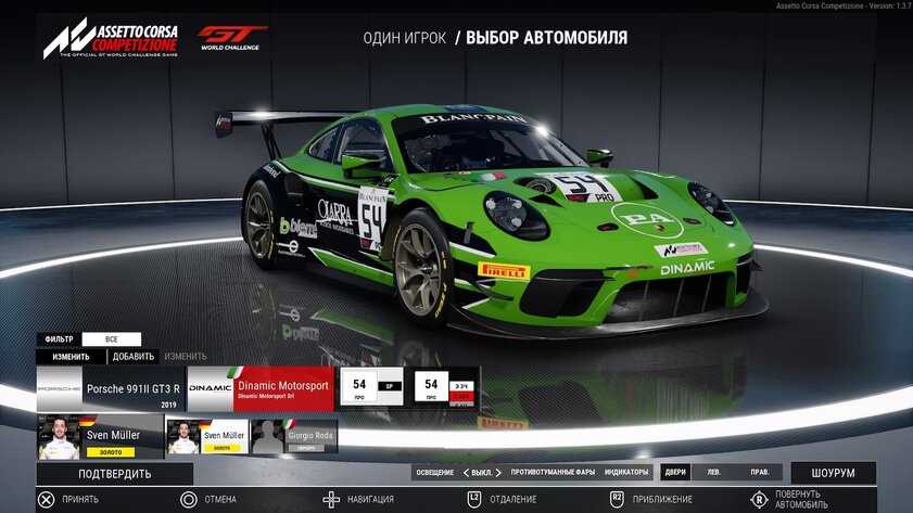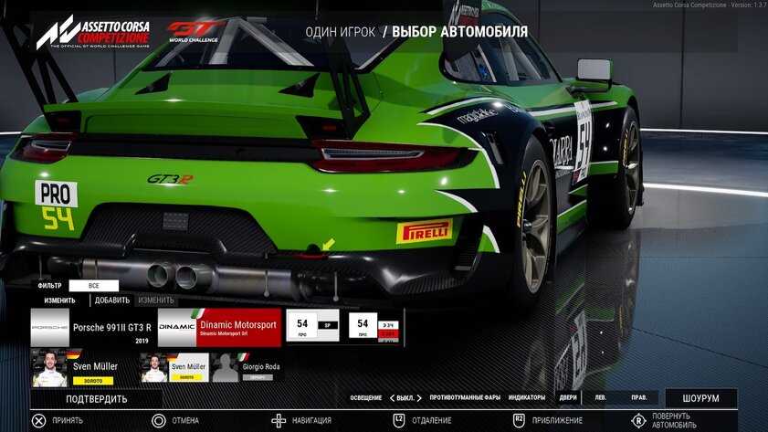 Детализация автомобилей действительно поражает — здесь прорисован каждый пиксель, каждый бампер, фара, спойлер и логотип компании-спонсора. В главном меню перед гонкой можно крутить автомобиль, увеличивать его, рассматривать каждую деталь. Выглядит отменно, а во время езды, когда на корпусе переливается солнечные лучи, зрелище просто завораживает. Фактически, у разработчиков был выбор — сделать сотню автомобилей, которые будут проработаны на уровне модов для GTA V, или сделать десять болидов, от которых у фанатов пойдут мурашки по коже. К счастью, авторы Assetto Corsa Competizione решили не уповать на богатый ассортимент, ограничившись небольшим автопарком.