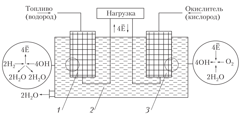 Рис. 3. Схема водородно-кислородного элемента: 1 – катод; 2 — электролит; 3 — анод