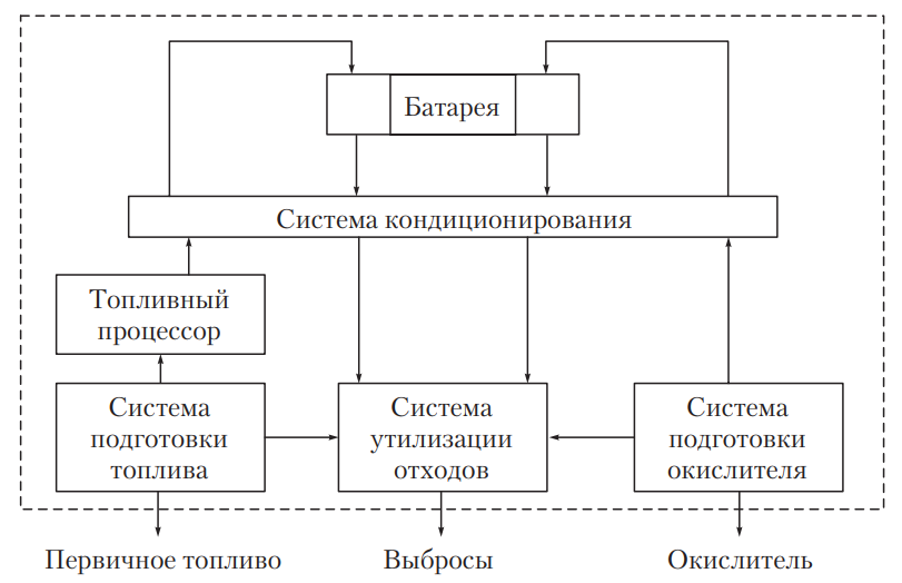Топливный элемент — составная часть электрохимического генератора, который, кроме того, содержит системы кондиционирования, подготовки топлива, утилизации отходов и др. (рис. 4). Первичным топливом могут быть метан, пары метанола, керосина, синтез-газ и т.д. Коэффициенты полезного действия у генераторов с топливными элементами изменяются от 30 % (двигатели внутреннего сгорания и газовые турбины) до 60…65 % (энергоустановки с твердооксидными топливными элементами).