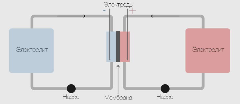 Электролиты располагаются в баках, каждый в своем, в ячейке из разделяет мембрана. Она не мешает электродам обмениваться ионной энергией, но и не допускает перемешивание топливной жидкости. Продукты реакции выводятся из ячейки при помощи жидкости, которая затем опять поступает в емкость по замкнутому контуру. Играя роль плюсовых и минусовых полюсов, эти электролиты и получили свое название «жидкие электроды». Отсюда и название АКБ — проточные или потоковые.