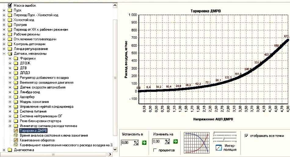 Под корректировкой подразумевается изменение тарировки или графика работы ДМРВ, занесенного в память блока. График зависимости построен таким образом, что при напряжении датчика 0,996 вольта расход считается равным нулю. Но если датчик вышел из строя и стартовое напряжение равно 1,055 вольта, то блок управления считает подачу воздуха 1,8 кг при неработающем моторе. Изменение графика при помощи утилиты «ДМРВ корректор» позволит выставить значение расхода 0, что улучшит характеристики работы двигателя. Подобный метод можно рекомендовать владельцам, хорошо разбирающимся в программном обеспечении блока управления.