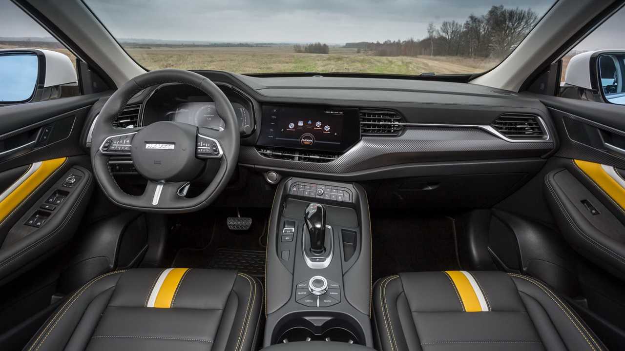 Полноприводный Хавал Ф7х с наддувным мотором 1.5 литра предлагается только в дорогом исполнении Premium (цена 1 759 000 рублей). Оно предусматривает наличие «кожаной» обивки с желтыми вставками, цифровой панели приборов диагональю 7.0 дюймов, люка с электроприводом, передних датчиков парковки, системы кругового обзора и шторок безопасности. В то же время набор электронных ассистентов кроссоверам с «младшим» двигателем почему-то не полагается. Адаптивный круиз-контроль, система предупреждения об опасности фронтального столкновения и система автоматического торможения предусмотрены только для версий с 2.0-литровым силовым агрегатом.