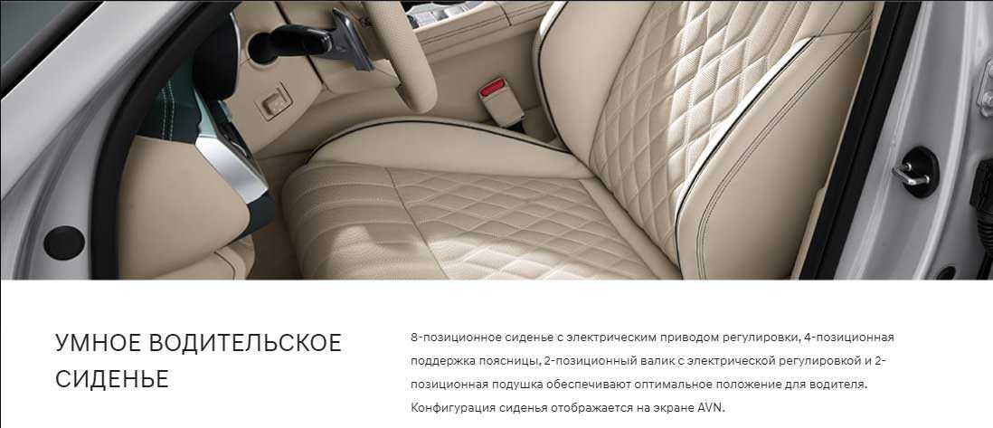 Особенное внимание в салоне уделено водительскому месту: в любой из модификаций кресло оснащается электроприводом, поясничной опорой с электрорегулировками, в дорогих комплектациях предусмотрены электрические настройки положений рулевой колонки