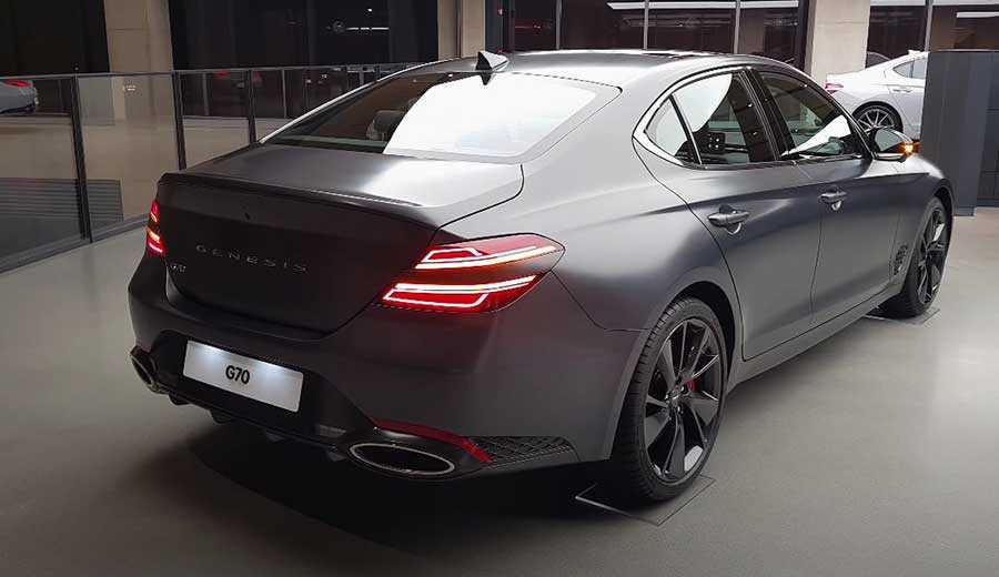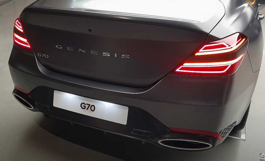 Корма Genesis G70 выделяется за счет заметного спойлера, размещенного на крышке багажного отсека, и довольно узкого стекла. Оригинальные по форме фары также дополняются светодиодными лентами. Строгий задний бампер включает в себя псевдодиффузоры и светоотражатели.