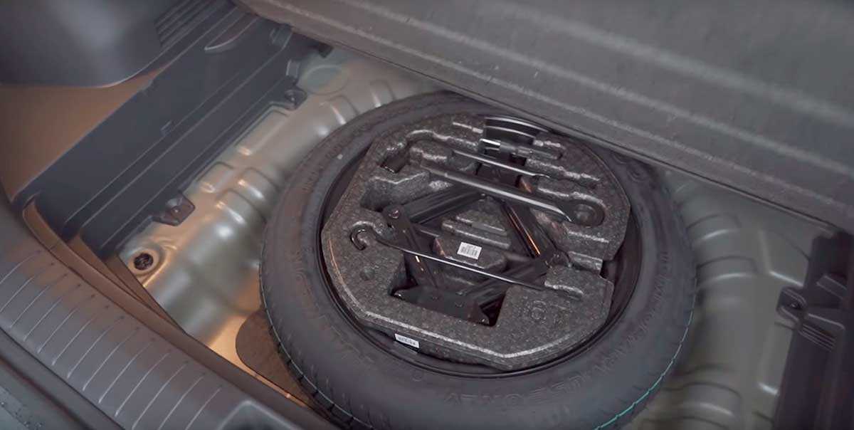 Багажная дверь на Hyundai Kona открывается с помощью наружной кнопки, под съемной фальшпанелью в нише находится малоразмерная запаска, есть и органайзер с инструментами.