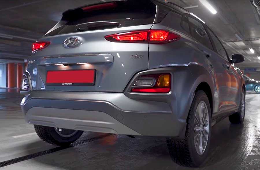 Задняя часть полностью повторяет переднюю. Сверху, сразу под подоконной линией расположились такие же узкие, прищуренные габаритные фонари, которые наполнены светодиодами, а ниже можно видеть такую же неокрашенную рамку, переходящую в колесные арки Hyundai Kona. Эта рамка наполнена стильными дублирующими габаритами и противотуманными фарами в форме бумеранга. Пластиковые накладки на задних колесных арках также переходят на задний бампер и образуют пластиковую накладку на нем, которую дизайнеры величали «доспехами».