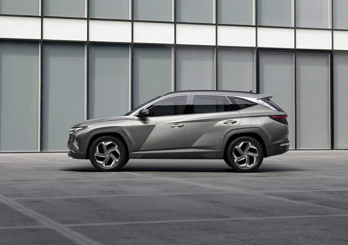 Профиль автомобиля смотрится не менее эффектно. Его отличают рельефные боковины, визуально увеличивающие объем дверей, колесные арки необычной прямоугольной формы, декоративная окантовка верхнего контура окон и немного наклонная линия крыши. Внедорожные возможности Hyundai Tucson подчеркивает пластиковый обвес, покрывающий нижнюю кромку кузова по всему периметру.