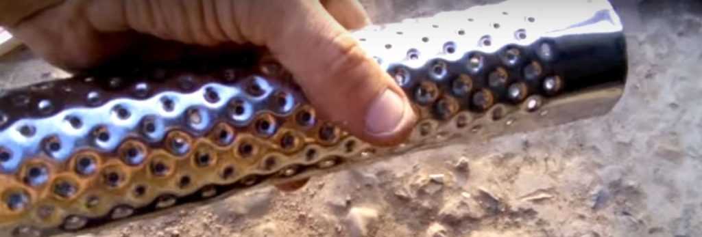 Чтобы сделать прямоток тише и получить «проходные» децибелы на выходе, применяется несложная конструкция, которая у автомобилистов называется флейта. Это кусок перфорированной трубки длиною 180–250 мм и диаметром чуть больше 1/3 выхлопа, с приваренной шайбой-заглушкой в виде диска, цилиндра или конуса, который на болтах крепится внутри прямотока, у воздушного среза, тем самым позволяя приглушить его.