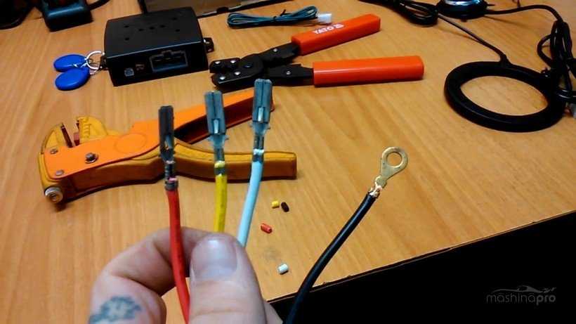 Так мы подключимся к колодке зажигания, к концевику тормозной педали и к кабелю управления. После запуска двигателя стартер работать не будет. Окраска проводов может быть другой, поэтому нужно смотреть на оттенки — например, провод может быть голубым, а не синим.
