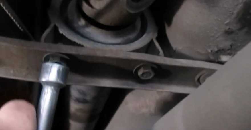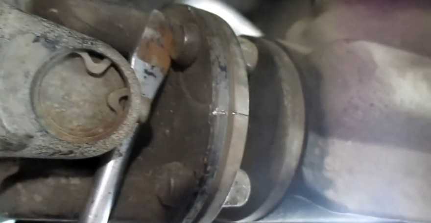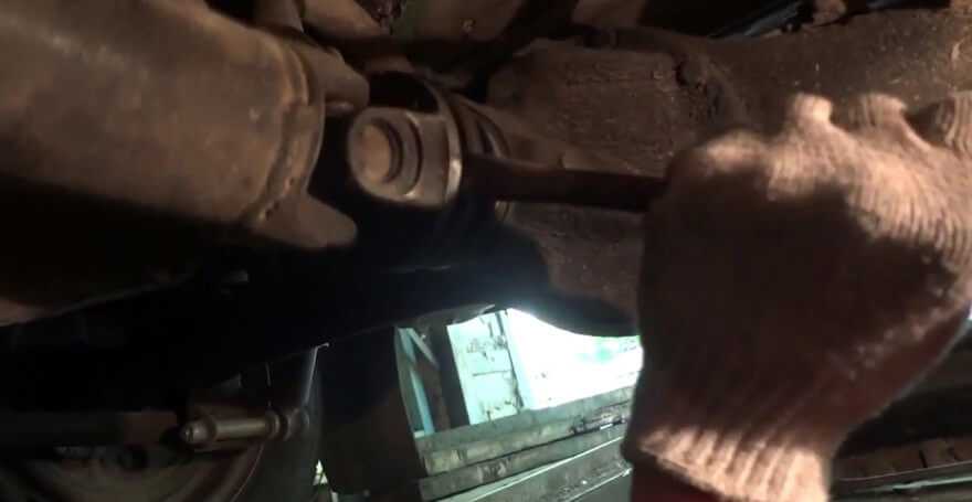 Ключом «на 13» отворачиваем две гайки крепления кардана к поперечине промежуточной опоры.