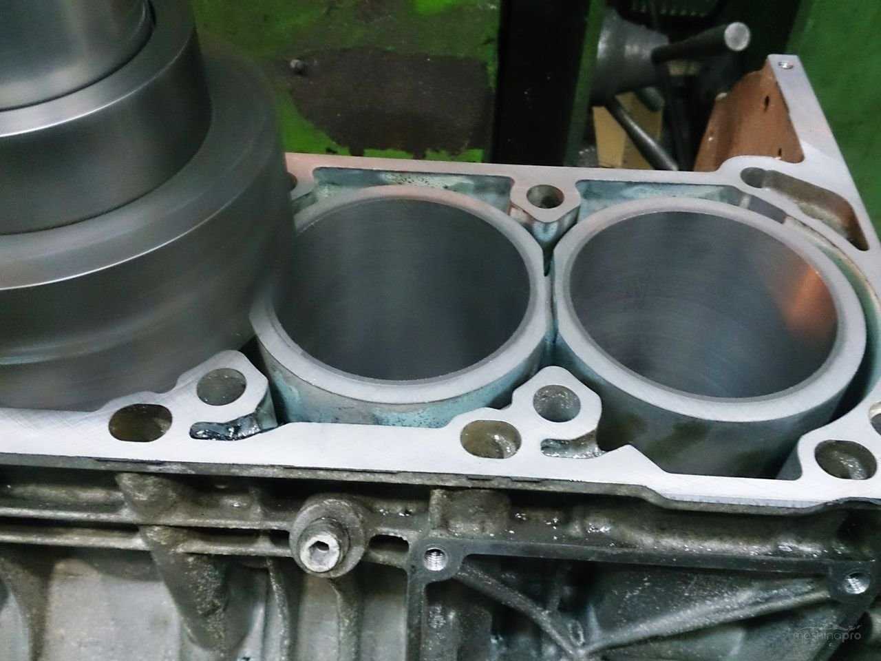Этот процесс начинается с расточки цилиндров под гильзы. На качество расточки очень сильно влияет ресурс ремонтируемого двигателя. Расточка блока позволяет добиться как необходимого размера, так и правильной геометрии гнёзд.